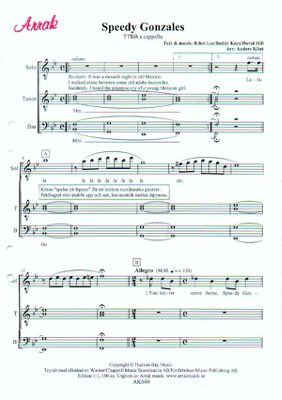 Övrig information Pat Boones 60-talshit. Ett spexigt arr av en spexig låt. Kräver en falsettsångare, en rockröst samt en avgrundsbas som recitatör. För övrigt är tonerna ganska enkla. Fungerar även att sjunga i blandad kör, damstämmorna tar då över tenorstämmorna (blir ganska lågt så klart).