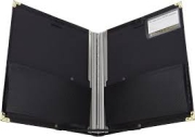 Svart körpärm för dirigenter eller för att ställa på piano med endera gummiband som håller i noterna eller medföljande hålslag (svensk standard) som enkelt kan fästas i ett eller två av gummibanden.