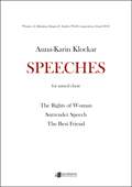 Speeches består av tre delar; The Rights of Woman, Surrender Speech och The Best Friend. I första delen består texten av delar ur “Declaration of the Rights of Woman” som Olympe de Gouges skrev 1791. de Gouges´ engagemang i kvinnliga rättigheter ledde till hennes död, hon avrättades med guillotine 1793. I den andra delen baseras texten på ett tal av den nordamerikanska indianstammen Nez Perces hövding Joseph. Talet är från när hövding Joseph gav upp till general Nelson i Montana-territoriet den 5:e oktober 1877. Det tredje styckets text baseras på George Graham Vests tal “A man’s best friend”. Talet var slutplädering i en rättegång i Warrensburg, Missouri den 23:e september 1870. George Graham Vest representerade en man som stämde en annan för att ha dödat hans hund.